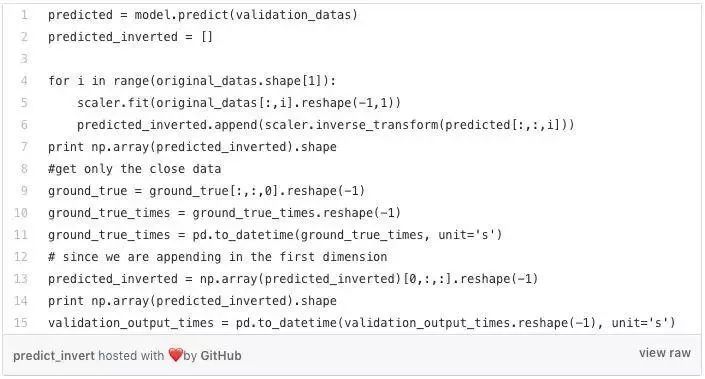 然后,我们需要对预测后的数据进行反向缩放,因为之前使用了MinMaxScaler,因此此时预测的数据范围是在[0,1]。
