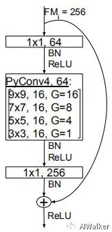 下图给出了在图像分类任务中PyConv模块示意图,它是将PyConv嵌入到Bottleneck中,这也是目前卷积改进的一种常用思路,好像没什么值得进一步深入介绍的。
