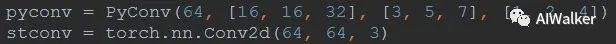 最后一点区别:PyConv为尽可能的降低计算量,在每一组内部还进行了分组卷积。经过前述一系列的组合确保了PyConv的计算量与标准卷积相当,但实际上推理速度还是标准卷积更快,三层时推理速度,比如下图配置时,pyconv在cpu上比标准卷积慢一倍之多,呵呵。