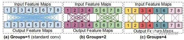 为使PyConv在不同层使用不同深度的卷积核,需要将输入特征划分为不同的组并独立的进行卷积计算,称之为组卷积(见下图示例)。不知各位有没有觉得这个思想跟谷歌的MixNet思想非常相似,MixNet中也是采用了类似组卷积方式进行不同尺寸卷积核计算,文末附对比分析。