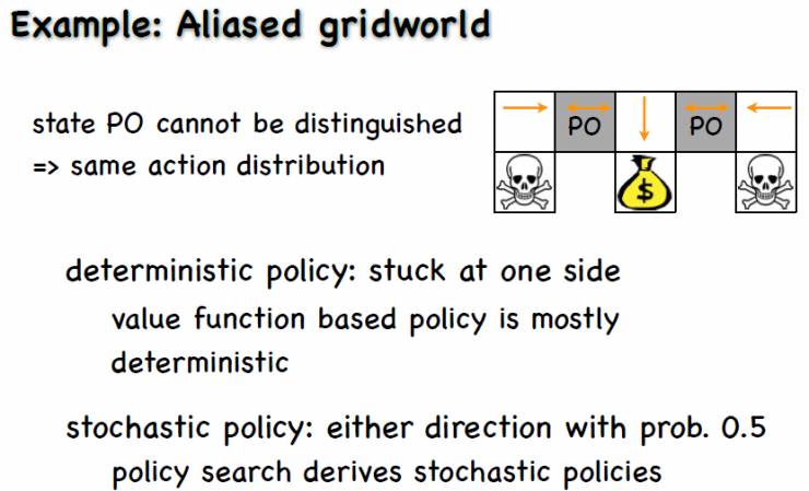 第三点用处很大,比如说玩“剪刀石头布”,如果选择确定性策略,那一定会输;一定要做一个带概率的输出才会赢。