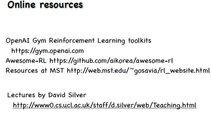 OpenAI Gym:一个基础的强化学习平台,里面很多环境,研究人员可以在上面做实验,它对这个领域有很大的促进。还有AlphaGo技术负责人David Silver的线上教学视频,讲的非常好。