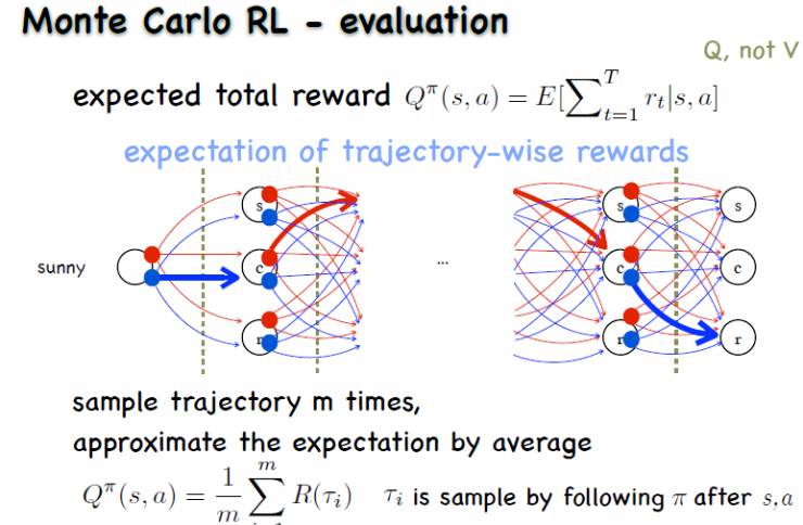 比如跑了之后我得到一条轨迹:先是出太阳,接着是多云,最后是出太阳;再跑第二次得到一条轨迹,再跑第三次又得到一个轨迹。最后得到很多轨迹。我知道每条轨迹的奖赏是多少,然后把这些轨迹的奖赏平均起来,作为这个策略的值函数的估计,用频率来逼近期望。