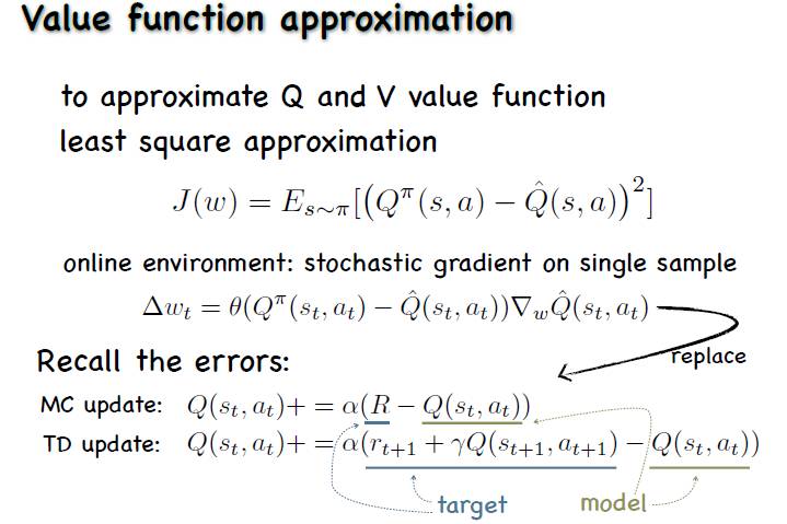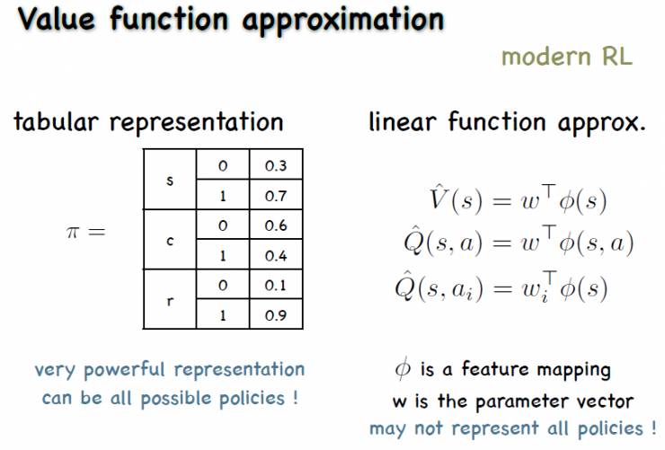 当遇到连续空间的问题时,用近似来表示值函数V和Q,这个做法看起来很自然,但是近似以后会发现,以往很多的理论结果就不成立了。
