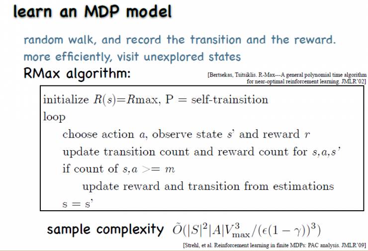 虽然看起来很简单,但是还原MDP的样本复杂度是状态数的平方,远高于前面说到的求解策略的复杂度。从这里可以看出学习MDP的复杂度极高,所以大量的研究工作都集中在免模型学习上。