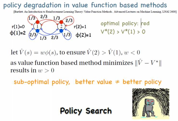 但是基于值函数的做法是要使得V值尽量靠近最优的V值,最优的V值又是正值,这样会导致这个W一定是正的,无法得到最优的策略。这样值函数估计得越准,策略越差的现象被称为策略退化。