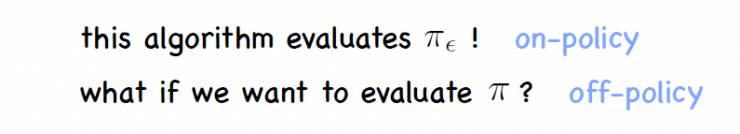 在蒙特卡洛采样中使用了πε策略来采样,学的并不是π,是带探索的πε。因为用来评估的数据,是从带探索的策略产出来的,而不是从我们想要学的策略上产生出来的。这个区别会导致把探索也作为策略的一部。这种采样与更新的策略是一样的算法叫做On Policy。