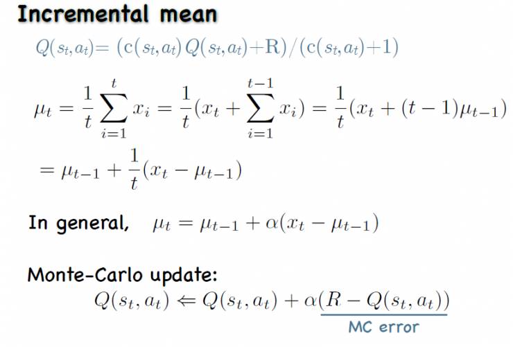 更新均值还可以写成:μt = μt-1 + α(xt _ μt-1),意思是刚才我们更新的是Q值(算式如下图显示),其中R − Q(st, at)叫做蒙特卡罗误差。我们知道,Q是对奖赏的一个估计,R是是采完这个轨迹以后得到的真实的奖赏。换句话说,Q值d饿更新就是加上就是真实值和估计值的差别,即蒙特卡罗误差。