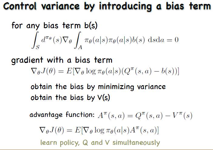 另一种控制方差的形式,是引入偏差项,只要这个函数是一个只跟状态有关、跟动作无关的函数,它的积分就是0,不影响梯度方向,而会影响梯度的方差。