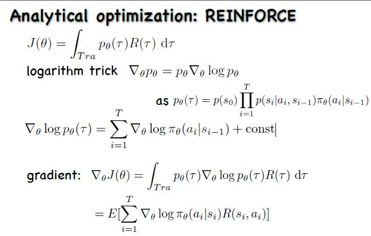 还有对策略直接求导的方法,比如无梯度的优化(Derivative-Free Optimization)。这类方法不管强化学习是在做什么,而是直接优化策略里面的参数。优化完参数以后,试一下策略,得出这个值具体是多少。