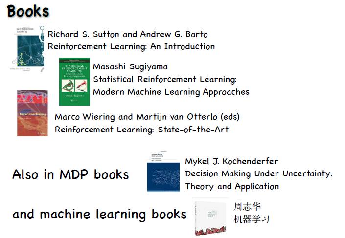 强化学习的书不多,最经典的书是Richard S. Sutton的教科书;Masashi Sugiyama的书属于专著;Reinforcement Learning: State-of-the-Art属于文集,覆盖面比较广,但需要读者有一定基础;还有一些讲述MDP的书;另外,在机器学习的书里面也会提到强化学习。