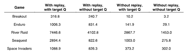 这里面,“with replay”和“without replay”的意思是有没有用到历史数据,“with target Q”和“without target Q”就用了CNN还是线性网络。我们可以看到,神经网络在这里贡献并不是最大的。如果我们只用神经网络而不用replay的话,效果还不如用了replay,但只用线性模型而不用CNN。当然,同时使用深度模型和强化学习是最好的,这可以完成一些过去完成不了的事情。