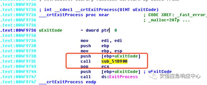 通过对代码进行逆向分析,发现在运行时函数_crtExitProcess中被植入了恶意的代码。