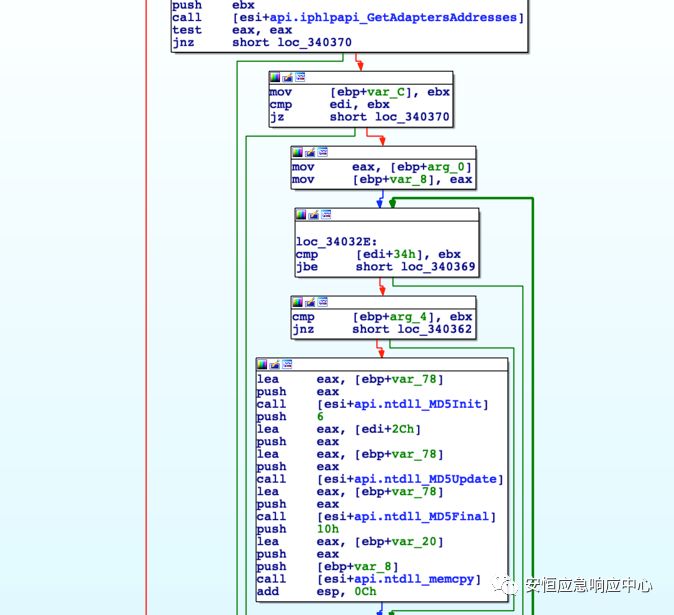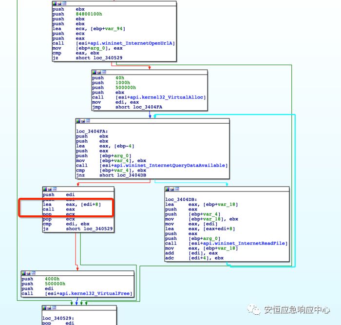 在该函数中包含大量解密操作后,在内存解密出Shellcode代码,动态计算出所需函数的api地址。