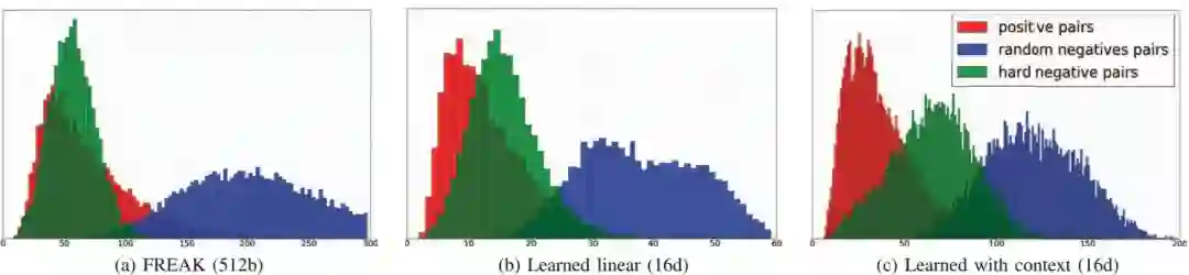 在该图中相对于匹配和非匹配图像块描述符之间的L2距离绘制了等式6。 与图3中的损失不同,我们在此更加强调匹配图像补丁之间的距离,要求尽可能小。即使有利于学习图像补丁功能,强制执行此约束也会导致性能下降(如果使用) 用于训练线性投影。