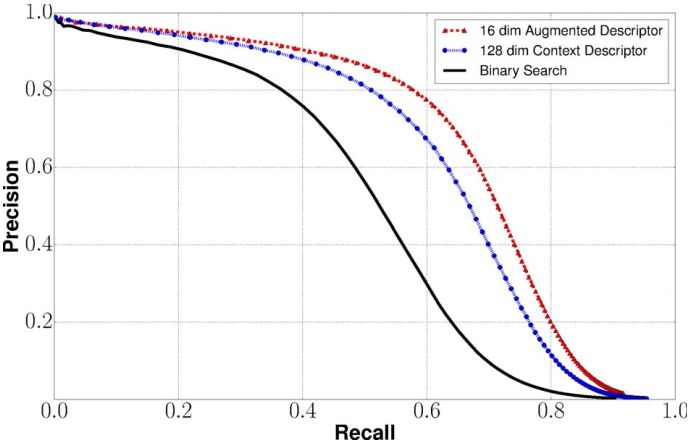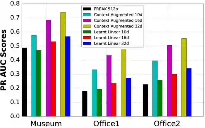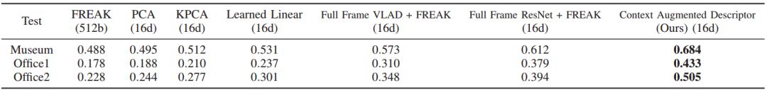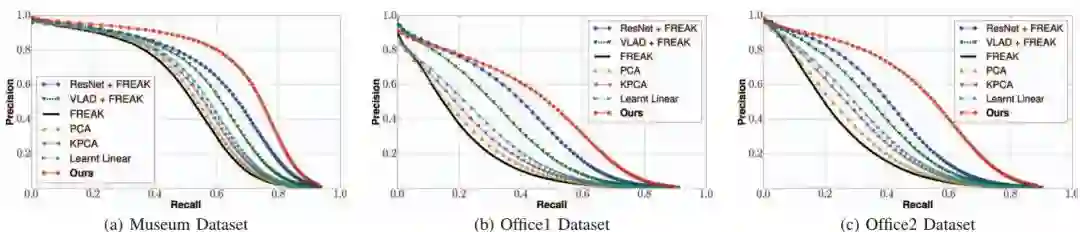 尽管在博物馆数据集的火车拆分中学到了,但我们的方法很好地概括了Office数据集的视觉上不同的数据。 实际上,可以观察到我们的线性和上下文增强投影始终优于所有基线方法。 有趣的是,使用FREAK描述符进行搜索的效果非常差。 我们认为这是由于我们的数据集中出现的外观发生了很大变化。 相应的PR AUC列于表II中。 除原始FREAK外,所有预测描述符都是16维浮点数。