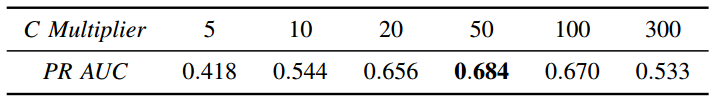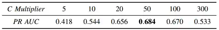 为了选择特征尺度的常数乘数,我们使用曲线下的精确回收面积(PR AUC)对其值进行交叉验证。 关于这一分数的更多细节将在第IV-A节中给出。 正如定性分析所预期的那样(图6),C = 50给出了最好的结果。