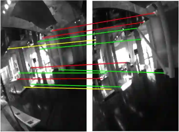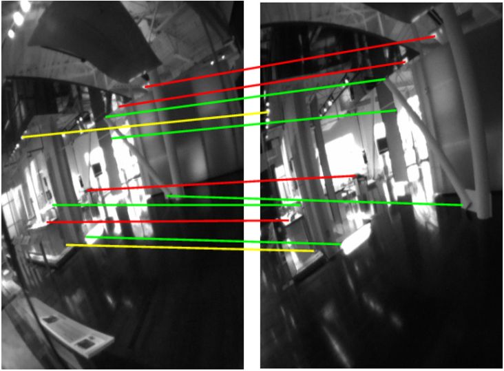 这里提出的描述符投影和增强方法在强烈的外观变化下实现了困难的描述符匹配。 然后,在不使用我们的投影技术的情况下仍然可以进行一些匹配(绿色),依赖于直接在二进制描述符空间中搜索。 然而,所提出的线性投影能够实现额外的,更具挑战性的匹配(黄色),可以通过包括更广泛的上下文信息(红色)来进一步改进。