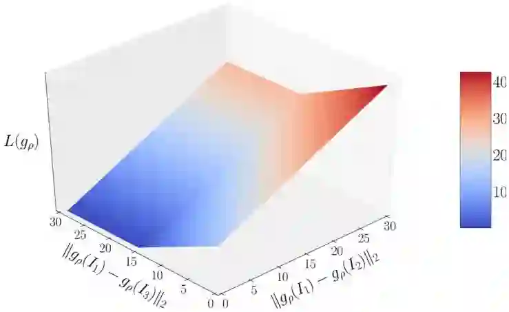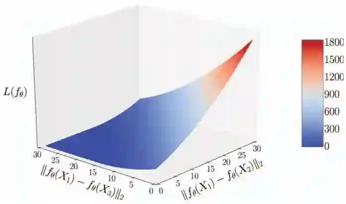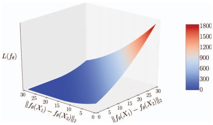 在该图中,等式3被绘制为匹配和非匹配样本之间的L2距离的函数。 即使在后面的参数中凸起,L(fθ)在投影函数参数θ中也不是凸的。
