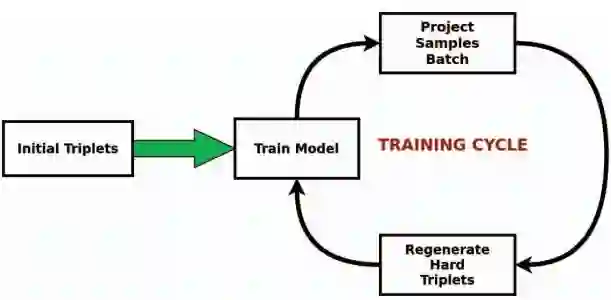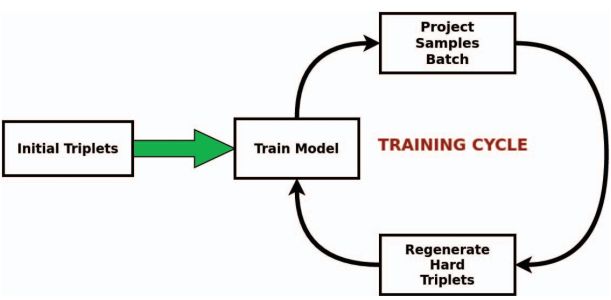 要初始化训练,应提供一些初始样本三元组。 在这些反向传播后,我们预测了一批训练样本,并用它们来制作新的硬三胞胎。 这些将用于继续训练模型。