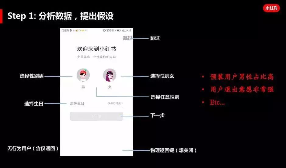 基于这样的数据表现,我们大致可以得出这样的假设,对很多之前不知道小红书的用户来说,打开APP第一个页面就需要填写隐私信息,对用户非常不友好,且载入流程较长,用户流失严重,导致整体的留存率较差。