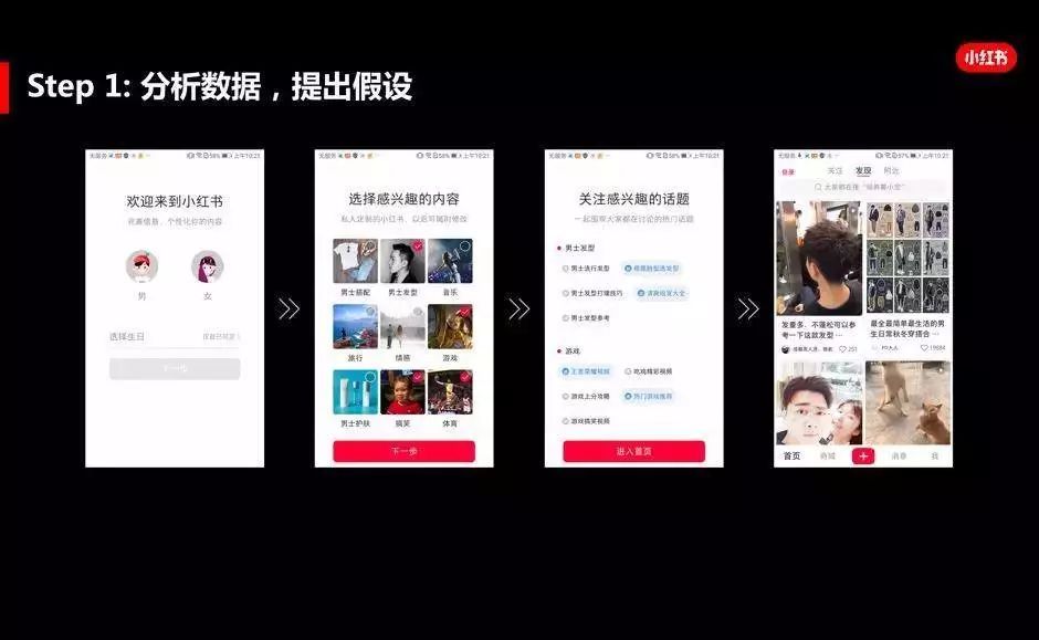 第三步,确定要做的事情之后,接下去就是具体的实施了。针对一些结果未知的改动,AB测试是个非常好用的方法。比如,我们针对预装渠道用户登录流程的改动,分三组做了实验。第一组用户和之前流程一样,第二和第三组用户我们都去掉了前面填写信息的页面,改成先看到内容,再填信息。其中不同的是,第二组用户进来就会弹窗让他们填,第三组用户会先引导他们看一篇内容,再让他们填信息。看看这三组用户最后的留存有什么差异。