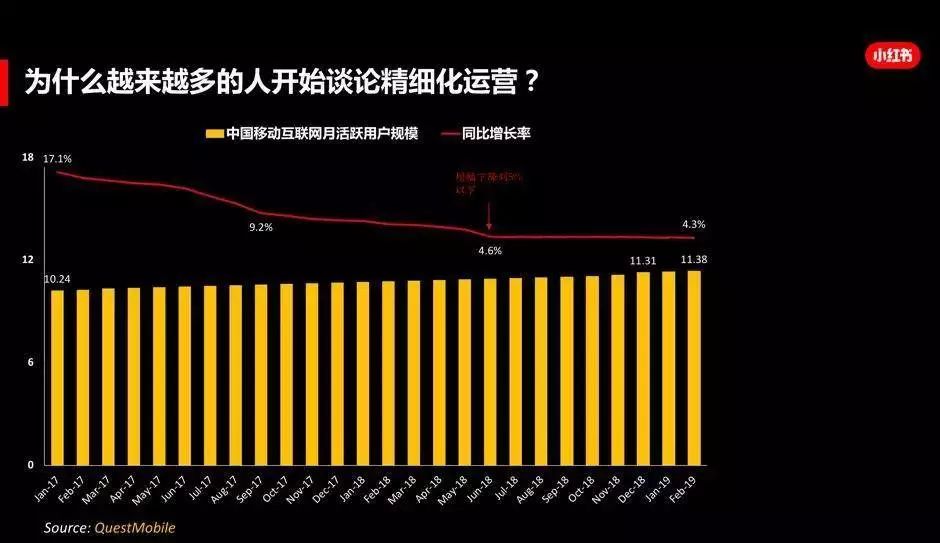 从QuestMobile在今年3月份发布的《移动互联网全景生态流量洞察报告》,大家可以看到,中国移动互联网用户规模增速在2018年6月已经降到5%以下,2019年2月份较去年12月仅增长700万用户,流量的竞争越发严峻。人口红利的消失,进而带来流量越来越贵,盘子就这么大,你要增长,就要去别人的盘子里抢。前段时间我还和一个朋友聊天,他说真怀念几年前1、2块钱买个激活用户的时代,现在,效果广告投放领域,动辄十几几十块买一个激活用户,教育,金融类行业,一个激活用户的成本甚至达到了成百上千块,流量的竞争激烈程度,从这些数字上大家就能明显的体会到。