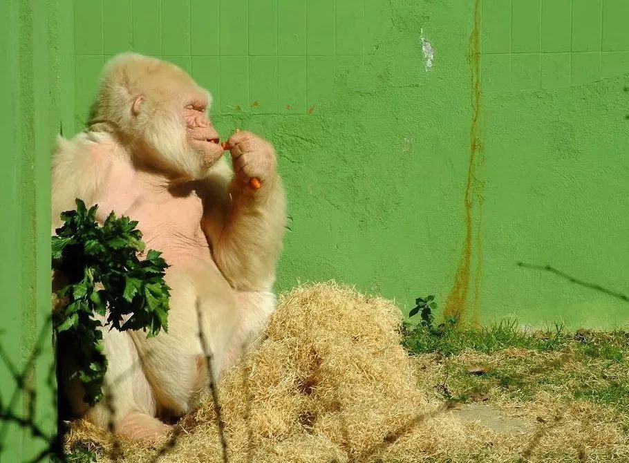 生活在巴塞罗那动物园的白化猩猩“小雪花”(Snowflake)。图源:Wiki.org
