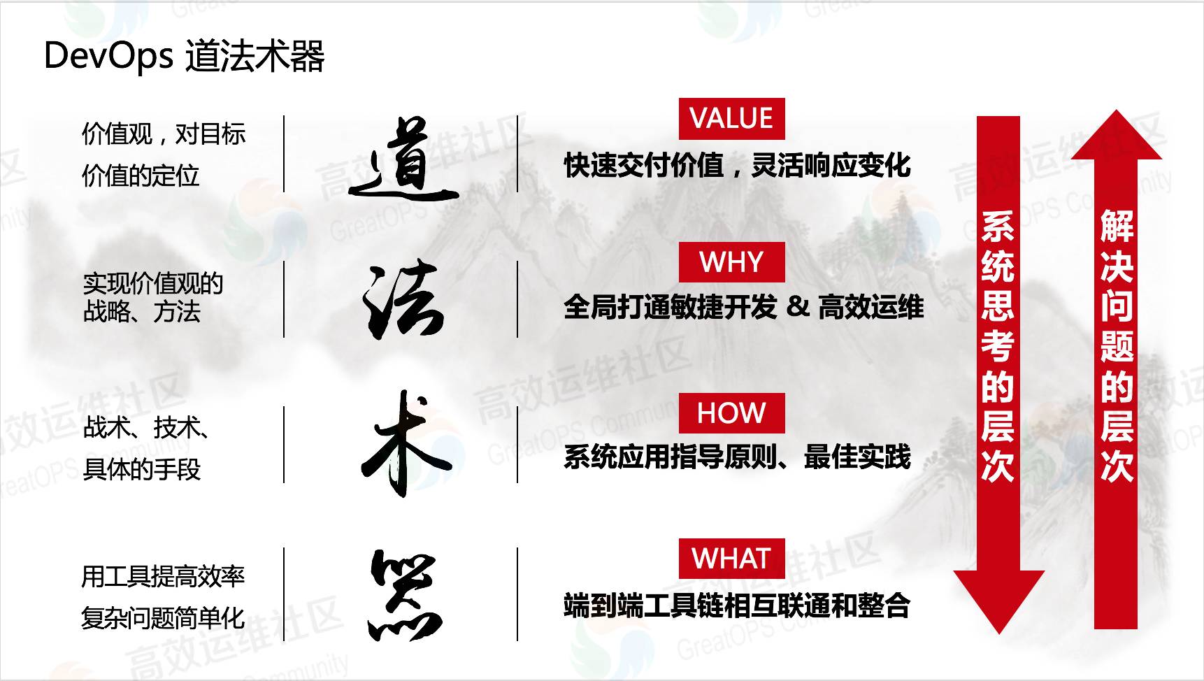 大家对DevOps的理解千差万别,对DevOps的落地更是感到无力和迷茫,DevOps时代和高效运维社区联合社区专家一起发布DevOps 道法术器,给出立体化的DevOps 落地方法框架。
