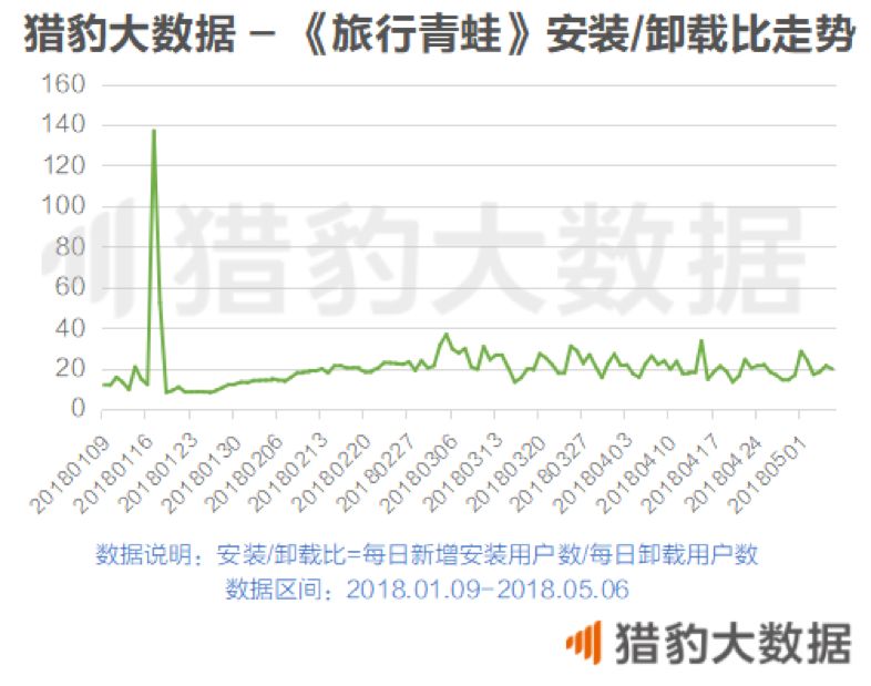 在最初的热度过后,该游戏的卸载人数经历了一个上升高峰,具体体现为安装/卸载比迎来低谷,但随后又逐渐稳定在20左右。