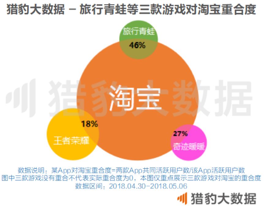 三、4月30日-5月6日这段时间,原版旅行青蛙活跃用户中,有46%为淘宝活跃用户。用户重叠度高,但延续游戏生命还需快速更新迭代。