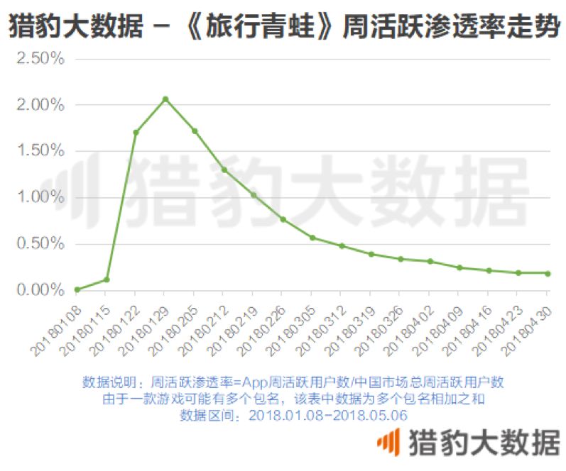 从猎豹大数据监测到的数据来看,《旅行青蛙》当前周活渗透率为0.17%,在我们此前发布的Q1中国手游榜单上排名第25。
