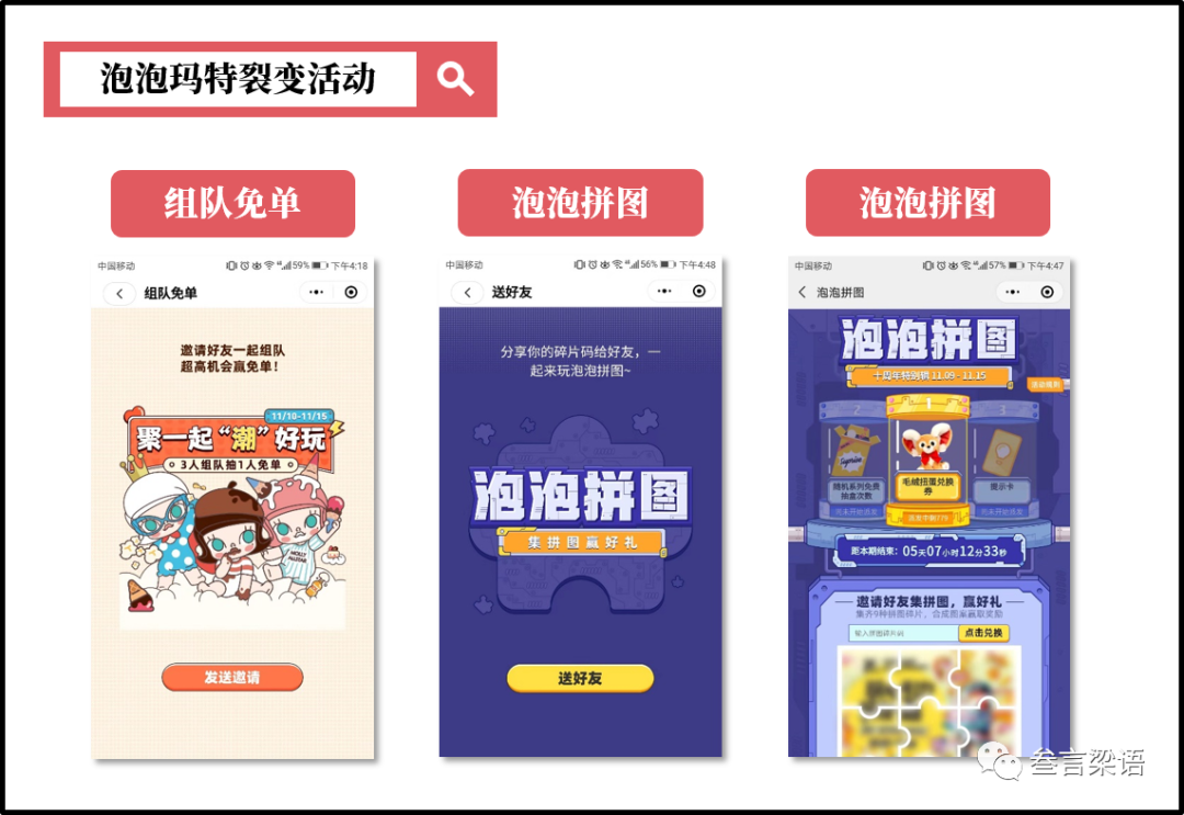 比如泡泡玛特的“组队免单”和“泡泡拼图”,用户可以邀请好友一起拼单、一起玩游戏,从而实现社交裂变。