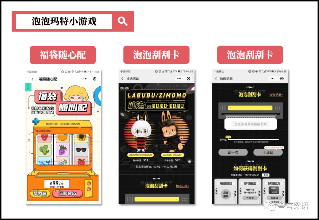 比如,泡泡玛特推出“福袋随心配”和“泡泡刮刮卡”小游戏,让消费者将购物置于玩乐之中。