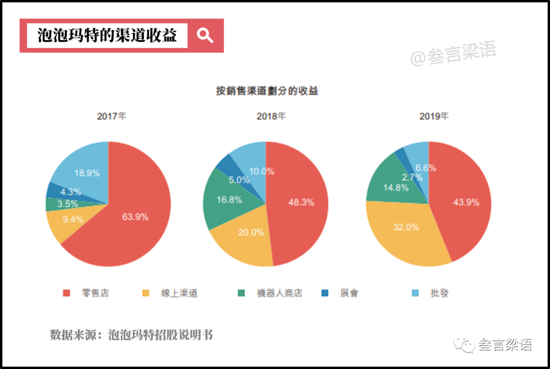 根据其招股说明书来看,2017年泡泡玛特的线上渠道收入仅占9.4%,2018年扩大到20.0%,2019年继续增长至32.0%。而占营收主要部分的线下零售店,收益比例却在不断缩小。