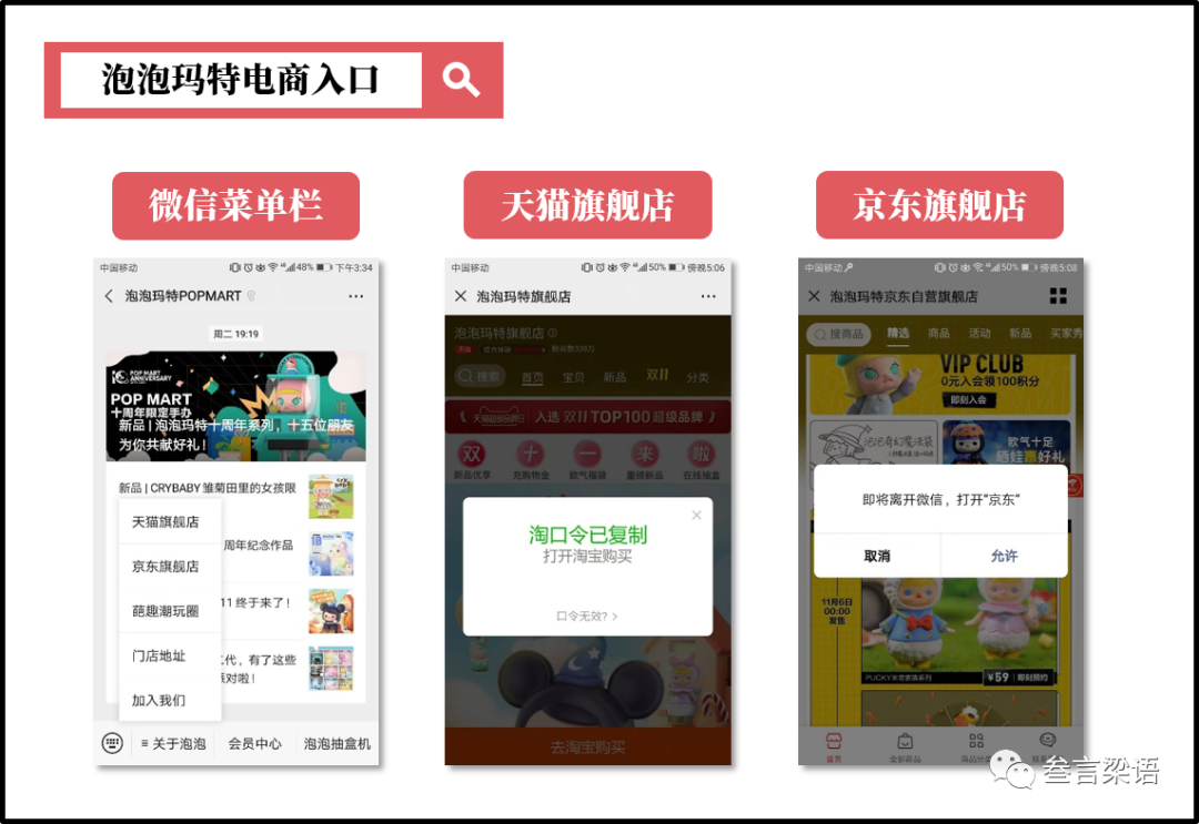 然而,我们看到不少品牌(比如拼多多、礼物说、连咖啡等)借力微信天然的社交属性,获得不错的裂变传播;而凭借「盲盒」掀起一股强劲潮流的泡泡玛特,其微信小程序的营收也超过了天猫旗舰店。