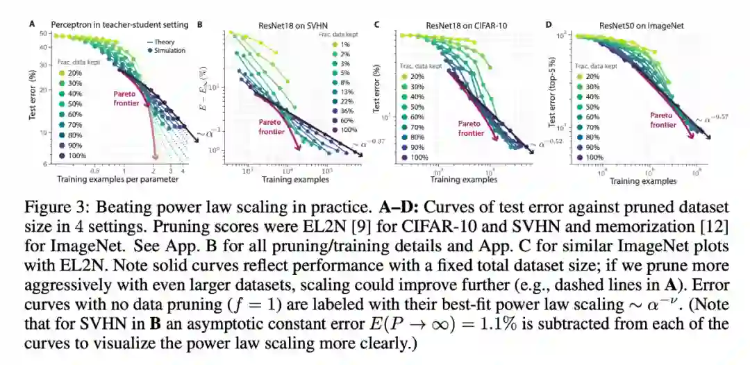 (3) 在初始数据集大小和所保留数据的分数上优化的测试误差,可以通过在更大初始数据集上进行更积极的剪枝,追踪出一个帕累托最优下包络线,打破了测试误差和剪枝数据集大小之间的幂律缩放函数关系。