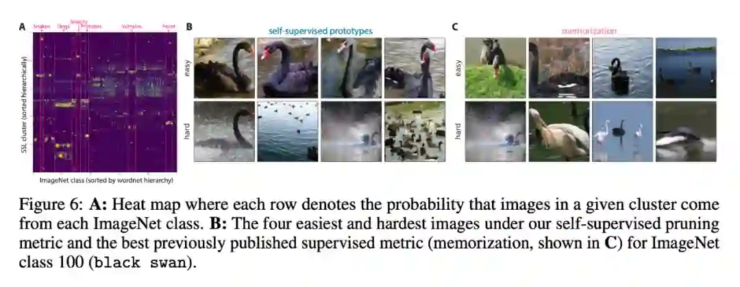 为了评估度量发现的聚类是否与 ImageNet 类一致,研究者在图 6A 中比较了它们的重叠。当保留 70% 以上的数据时,自监督度量和监督度量的性能是相似的,这表明了自监督剪枝的前景。
