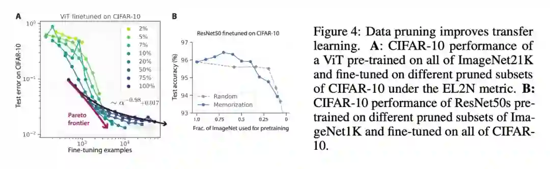 此外,研究者发现数据剪枝可以提升迁移学习的表现。他们首先分析了在 ImageNet21K 上预训练的 ViT,然后在 CIFAR-10 的不同剪枝子集上进行了微调。有趣的是,预训练的模型允许更积极的数据剪枝;只有 10% 的 CIFAR-10 的微调可以媲美或超过所有 CIFAR-10 的微调所获得的性能 (图 4A)。此外,图 4A 提供了一个在微调设置中打破幂律缩放的样本。