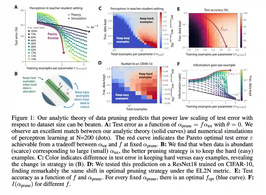 1. 利用统计力学,开发了一种新的数据剪枝分析理论,在师生感知机学习环境中,样本根据其教师边际进行剪枝,大 (小) 边际各对应于简单 (困难) 样本。该理论在数量上与数值实验相符,并揭示了两个惊人的预测: