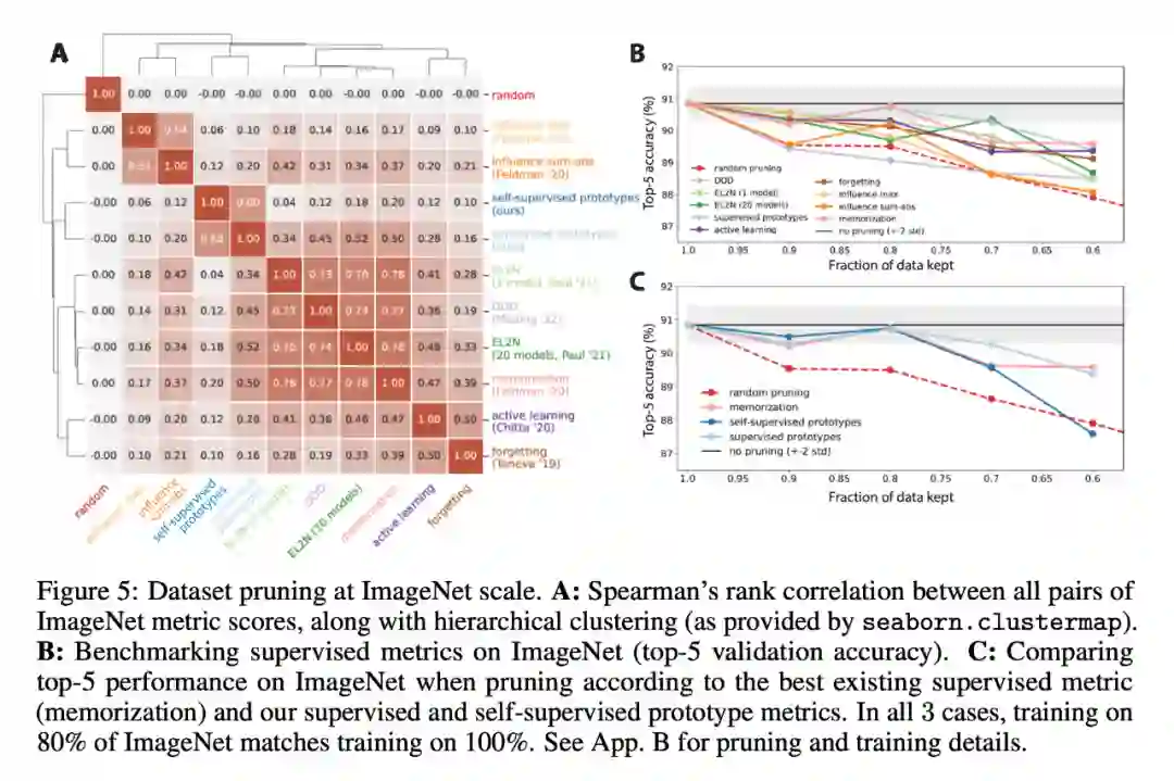 他们观察到度量之间的显著性能差异:图 5BC 显示了当每个度量下的最难样本的一部分保留在训练集中时的测试性能。在较小的数据集上,许多度量取得了成功,但选择一个明显较小的训练子集(如 Imagenet 的 80%)时,只有少数度量在完整数据集训练中仍然获得了相当的性能。