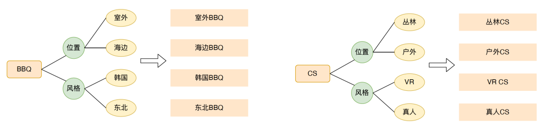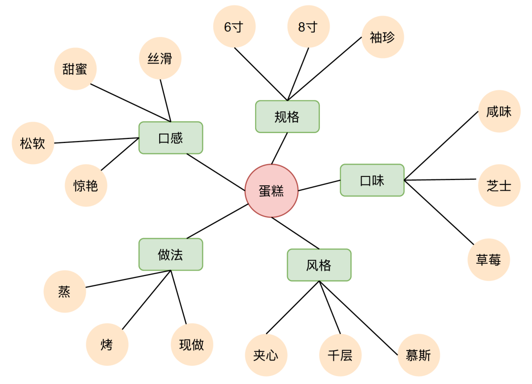 在常识性概念图谱中,建立了很丰富的概念以及对应属性及其属性值的关系,通过一个相对比较泛的Query,可以生成对应细化的Query。例如蛋糕,可以通过口味这个属性,产出草莓蛋糕、芝士蛋糕,通过规格这个属性,产出6寸蛋糕、袖珍蛋糕等等。