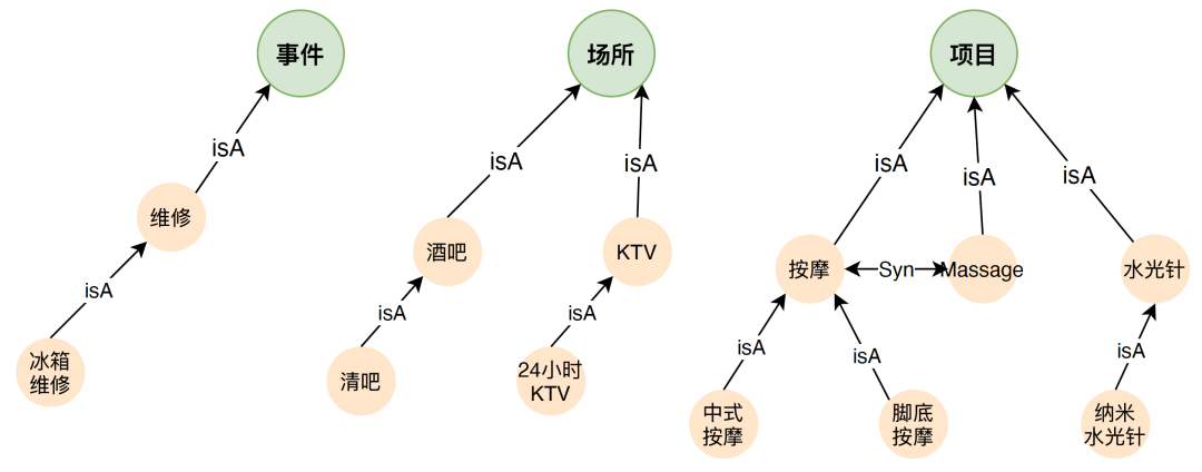 同义/上下位关系:语义上的同义/上下位关系,例如脸部补水-syn-面部补水等。定义的Taxonomy体系也是一种上下位的关系,所以归并到同义/上下位关系里。