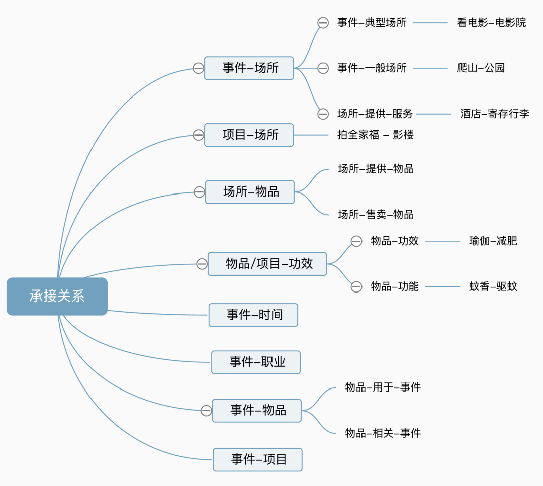 概念承接关系:这类关系主要建立用户搜索概念和美团承接概念之间的链接,例如踏春-场所-植物园,减压-项目-拳击等。