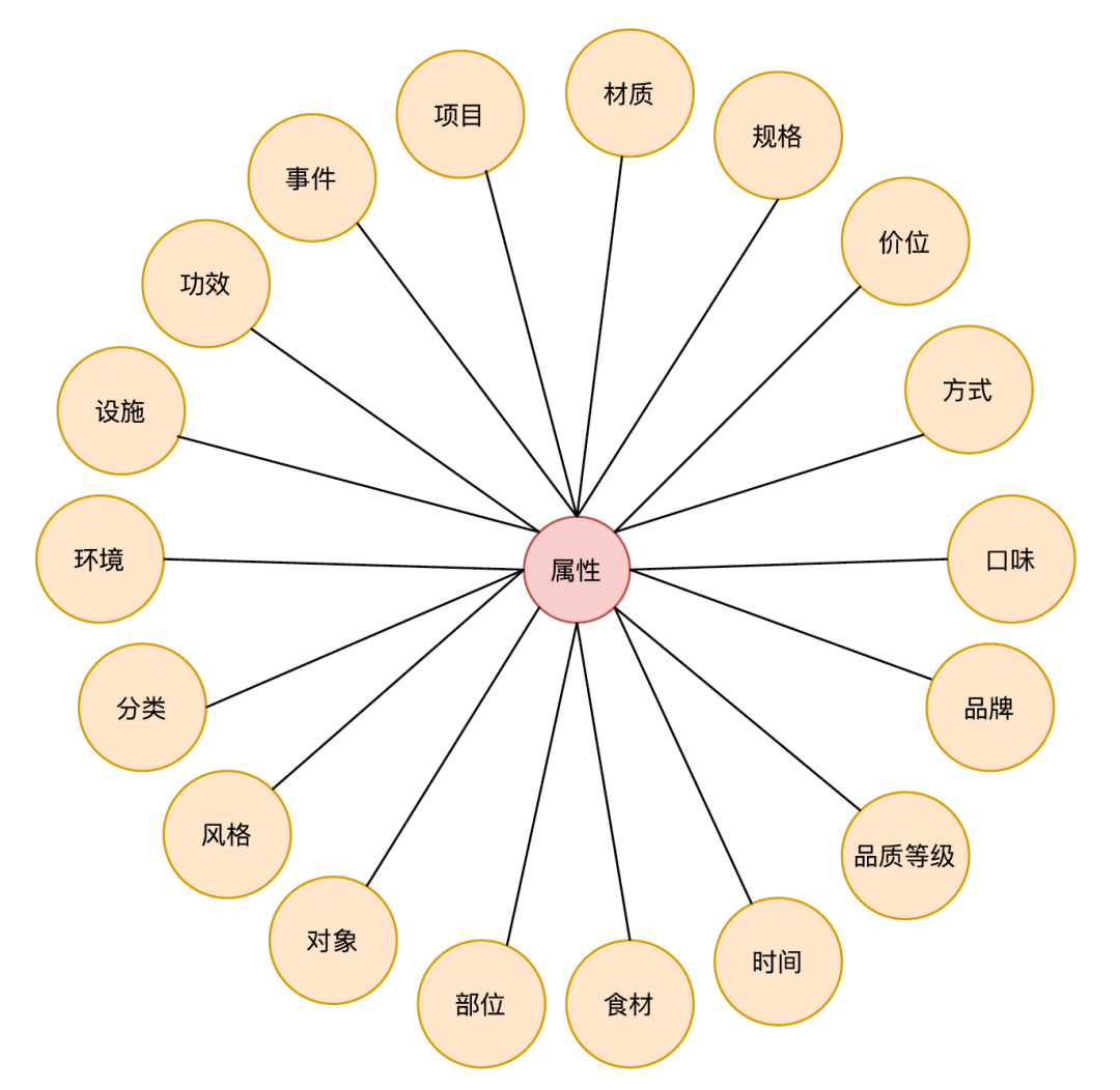 概念属性关系:是典型的CPV(Concept-Property-Value)关系,从各个属性维度来描述和定义概念,例如火锅-口味-不辣,火锅-规格-单人等,示例如下: