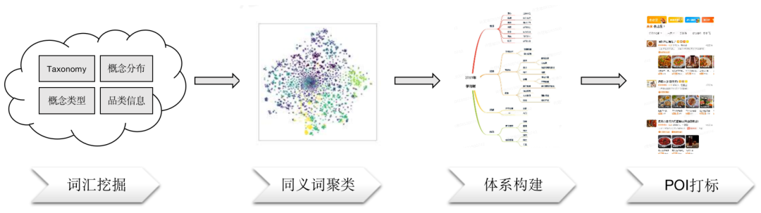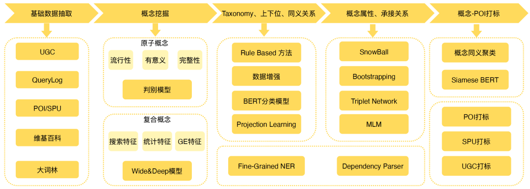 POI/SPU-概念关系:POI作为美团场景中的实例,实例-概念的关系作为知识图谱中最后的一站,常常是比较能发挥知识图谱在业务上价值的地方。在搜索、推荐等业务场景,最终的目的是能够展示出符合用户需求的POI,所以建立POI/SPU-概念的关系是整个美团场景常识性概念图谱重要的一环,也是比较有价值的数据。