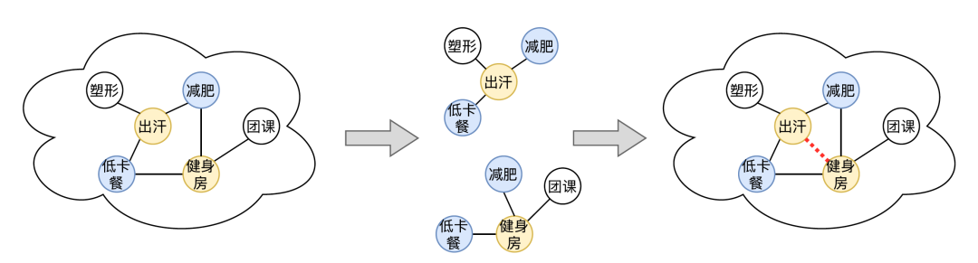 通过上述两个阶段,已经从非结构化的文本信息中构建出了一个初具规模的概念承接关系的图谱。但是由于语义模型的局限性,当前图谱中存在大量的三元组缺失。为了进一步丰富概念图谱,补全缺失的关系信息,我们应用知识图谱链接预测中的TransE算法以及图神经网络等技术,对已有的概念图谱进行补全。
