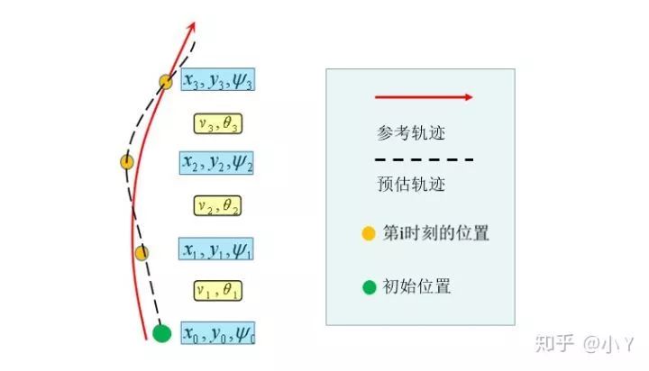上图为模型预测控制的一个示意图,在当前位姿下,使用运动学模型对后续n个时刻的位姿进行估计,使用非线性优化器求解出cost最小的控制量v和delta