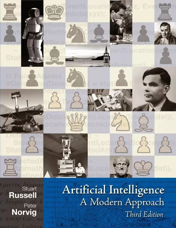 如果翻开当下最流行的AI教材之一——《人工智能:一种现代方法》(AIMA),我们会直接注意到书本开篇就是介绍搜索、约束满足问题、一阶逻辑和规划。第三版封面(见下图)像一张大棋盘(因为棋艺精湛是人类智慧的标志),还印有阿兰·图灵(计算机理论之父)和亚里士多德(最伟大的古典哲学家之一,象征着智慧)的照片。