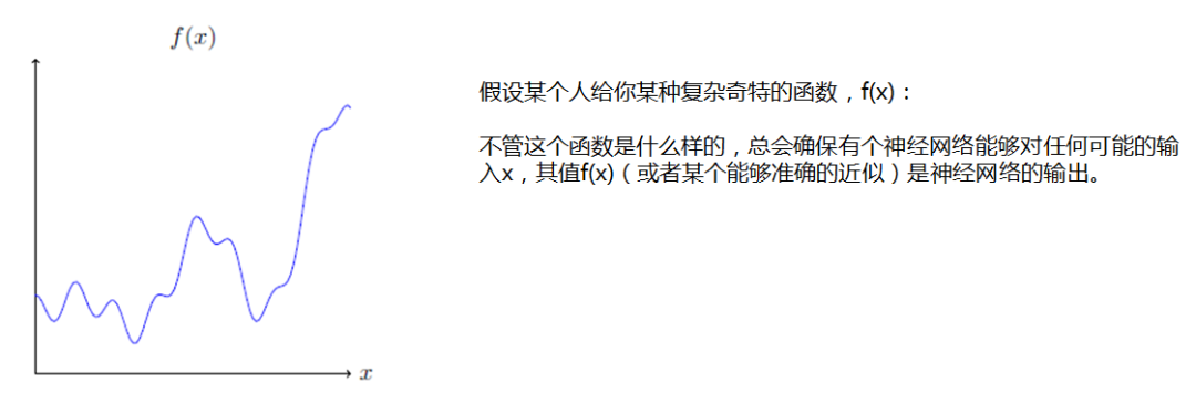 不管这个函数是什么样的,总会确保有个神经网络能够对任何可能的输入x,其值f(x)(或者某个能够准确的近似)是神经网络的输出。